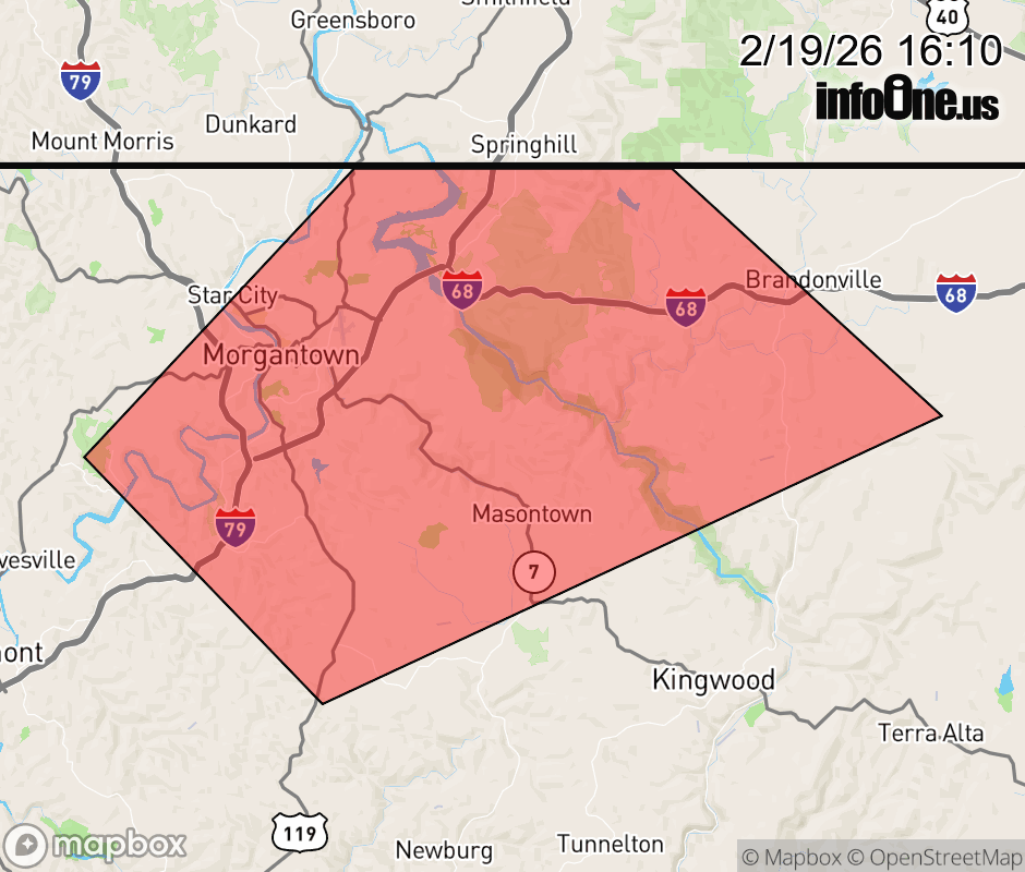 Canceled 2/19/26 4:22 PM Severe Thunderstorm Warning issued February 19 at 4:08PM EST until February 19 at 4:30PM EST by NWS Pittsburgh PA At 408 PM EST, a severe thunderstorm was located 5 miles southwest of Brookhaven, or 6 miles south of Westover, moving northeast at 50 mph. HAZARD...Quarter size hail. SOURCE...Radar indicated. IMPACT...Damage to vehicles is expected. Locations impacted include... Morgantown, Westover, Star City, Granville, Brookhaven, Reedsville, Masontown, Bruceton Mills, Cheat Lake, Laurel Run, Browns Chapel, Booth and Valley Point. ![]() |