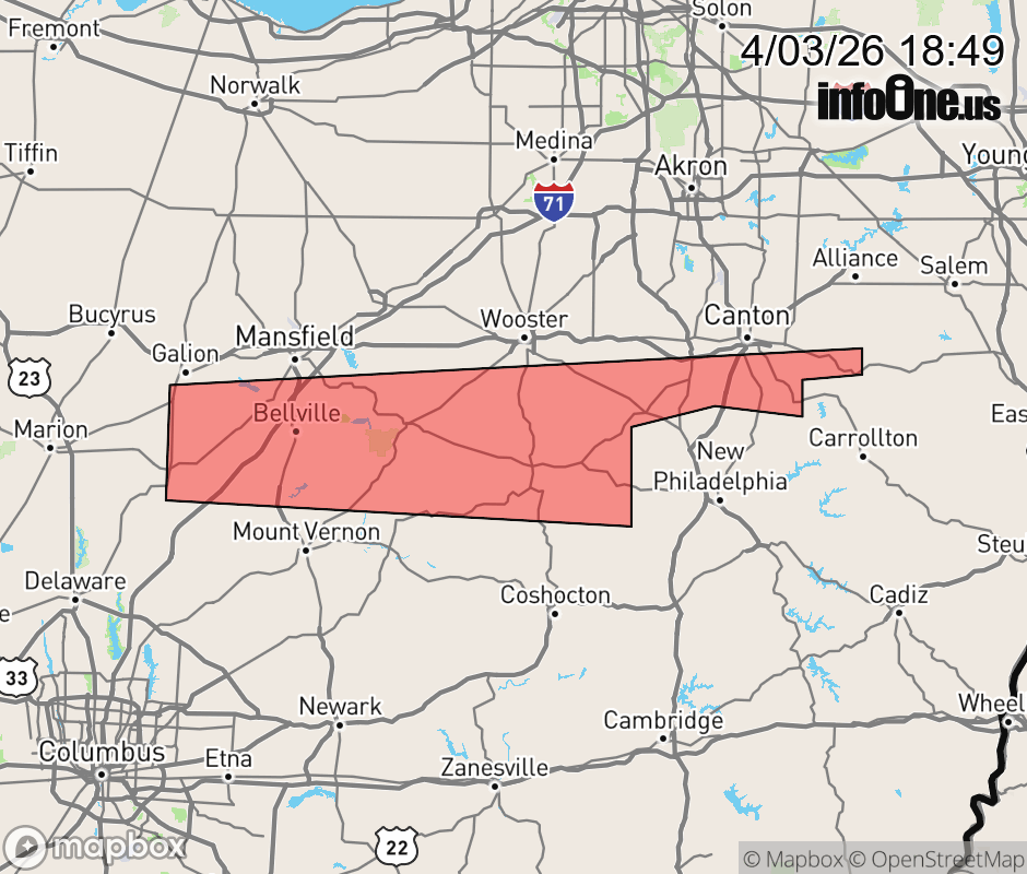 Canceled 4/3/26 7:38 PM Flood Advisory issued April 3 at 6:48PM EDT until April 3 at 10:00PM EDT by NWS Cleveland OH * WHAT... Flooding caused by excessive rainfall is expected. * WHERE... Portions of north central and northeast Ohio, including the following counties, in north central Ohio, Ashland, Knox, Morrow and Richland. In northeast Ohio, Holmes, Stark and Wayne. * WHEN... Until 1000 PM EDT. * IMPACTS... Minor flooding in low-lying and poor drainage areas. * ADDITIONAL DETAILS... - At 648 PM EDT, Doppler radar indicated heavy rain due to thunderstorms. Minor flooding is ongoing or expected to begin shortly in the advisory area. Between 0.5 and 1.5 inches of rain have fallen. - Some locations that will experience flooding include... Canton, Mansfield, Mount Gilead, Millersburg, Massillon, Berlin, Lexington, Walnut Creek, Minerva, Loudonville, Fredericktown, Brewster, Navarre, Bellville, Shreve, Waynesburg, East Sparta, Killbuck, Holmesville and Wilmot. - Please visit www.weather.gov/safety/flood for flood safety and preparedness information. ![]() |