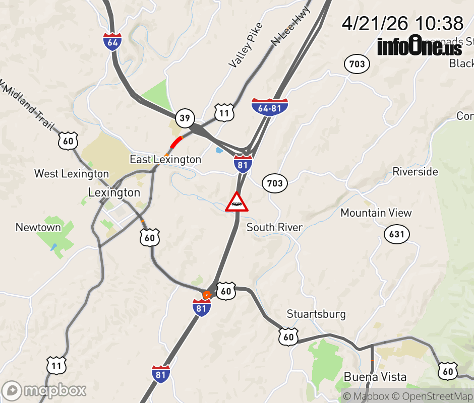 On I-81 South at mile marker 190.5 in the County of Rockbridge, motorists can expect delays due to a tractor trailer crash. Updated: Tue 4/21/26 10:38 AM EDT ![]() Updated: Tue 4/21/26 10:38 AM EDT |