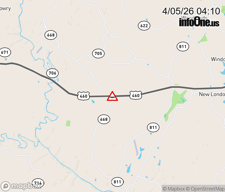 On US-460 West in the County of Bedford, in the vicinity of Blackwater Rd; Rt. 668N/S (Bedford County), motorists can expect delays due to a vehicle crash. Lane closures exist. Updated: Sun 4/5/26 4:10 AM EDT ![]() Updated: Sun 4/5/26 4:10 AM EDT |