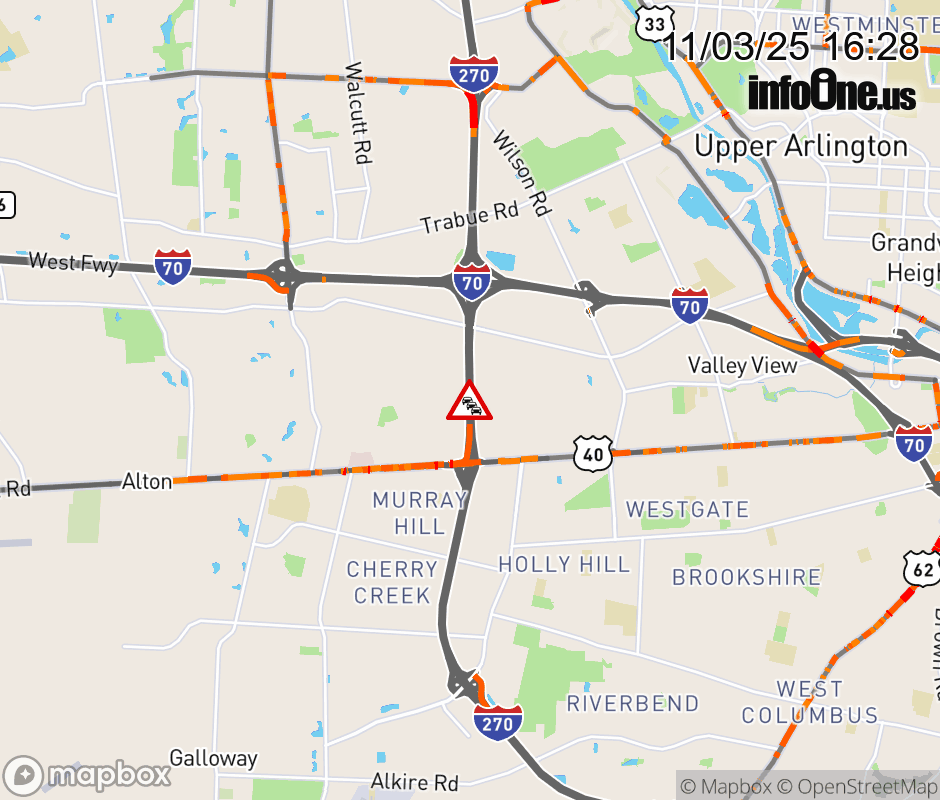 The center lane is blocked on I-270 North beyond US-40/W Broad St, due to debris on roadway. ![]() |