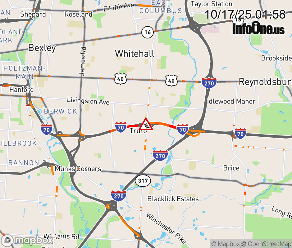 I-70 CLOSED in BOTH DIRECTIONS at SR-317 North/Hamilton Rd (MM: 107.4), due to utility lines debris on roadway. Use alternate route. ![]() |