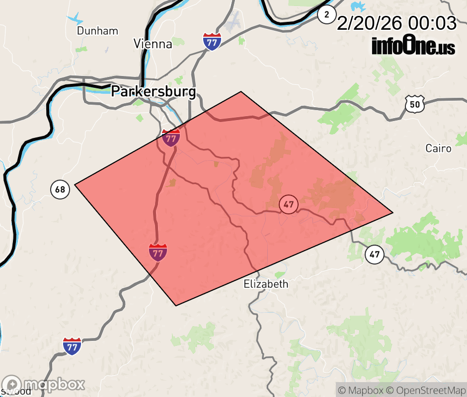 Canceled 2/20/26 12:15 AM Special Weather Statement issued February 20 at 12:02AM EST by NWS Charleston WV At 1202 AM EST, Doppler radar was tracking a strong thunderstorm over Mineralwells, or near Parkersburg, moving northeast at 50 mph. HAZARD...Wind gusts up to 40 mph and half inch hail. SOURCE...Radar indicated. IMPACT...Gusty winds could knock down tree limbs and blow around unsecured objects. Minor hail damage to vegetation is possible. Locations impacted include... Parkersburg, Mineralwells, Freeport, Walker, Davisville, Greencastle, and Rockport. This includes the following highways... Interstate 77 in West Virginia between mile markers 162 and 174. Route 50 in West Virginia between mile markers 12 and 17. ![]() |