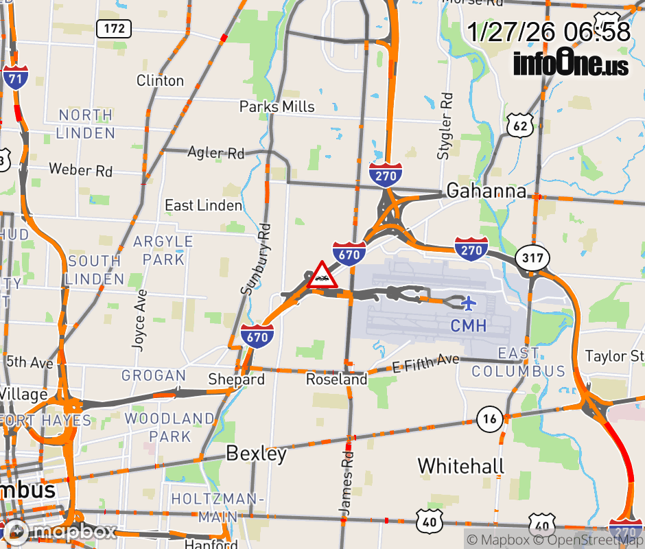 The right lane is blocked on I-670/US-62 West at Airport/Cassady Ave/Stelzer Rd, due to a disabled vehicle. ![]() |