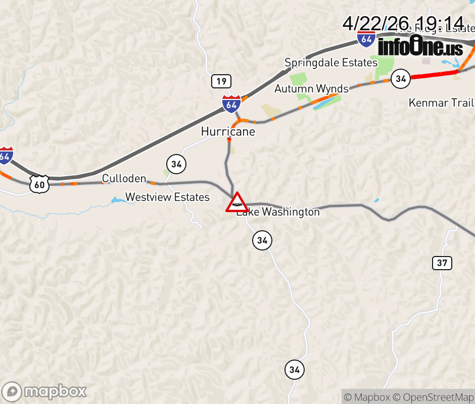 Vehicle Crash on US-60 & WV-34. The westbound road is closed. The eastbound road is closed. Updated: Wed 4/22/26 7:14 PM EDT ![]() Updated: Wed 4/22/26 7:14 PM EDT |