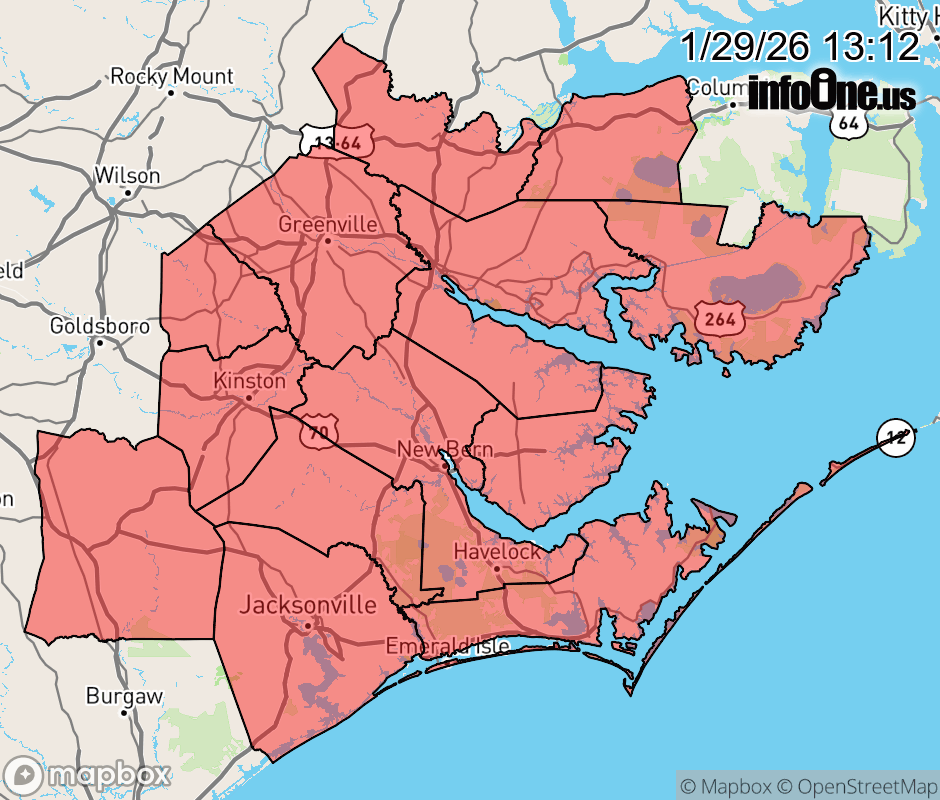 Canceled 1/30/26 1:08 AM Extreme Cold Watch issued January 29 at 1:11PM EST until February 1 at 10:00AM EST by NWS Newport/Morehead City NC * WHAT... Dangerously cold wind chills as low as 5 below possible. * WHERE... A portion of eastern North Carolina. * WHEN... From late Saturday night through Sunday morning. * IMPACTS... The cold wind chills as low as 5 below zero could result in hypothermia if precautions are not taken. Frostbite and hypothermia will occur if unprotected skin is exposed to these temperatures. ![]() |