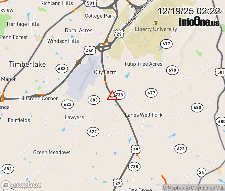 On US-29 in the County of Campbell, in the vicinity of English Tavern Rd; Rt. 738N/S (Campbell County), motorists can expect delays due to a vehicle crash. The south right lane and right shoulder are closed. Updated: Fri 12/19/25 2:22 AM EST ![]() Updated: Fri 12/19/25 2:22 AM EST |