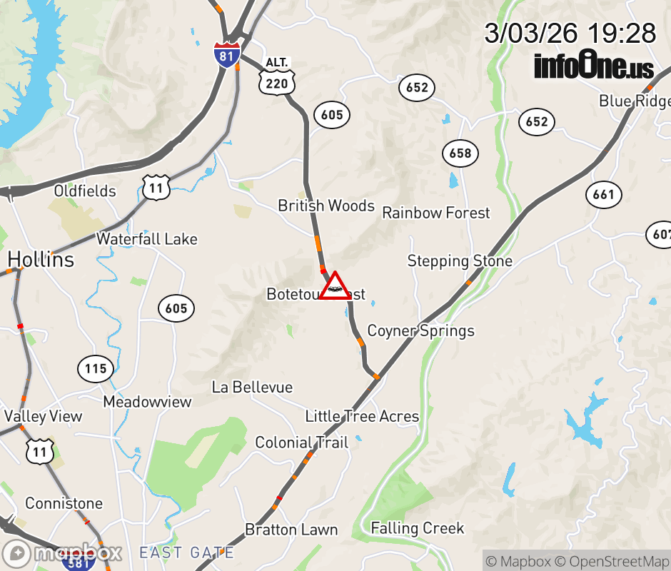 On ALT VA-220 North in the County of Botetourt, in the vicinity of Cloverdale Rd; Deer Ridge Trl; Hillview Dr; Old Carriage Rd; Rt. 1420N/S (Botetourt County), motorists can expect delays due to a vehicle crash. Lane closures exist. ![]() |