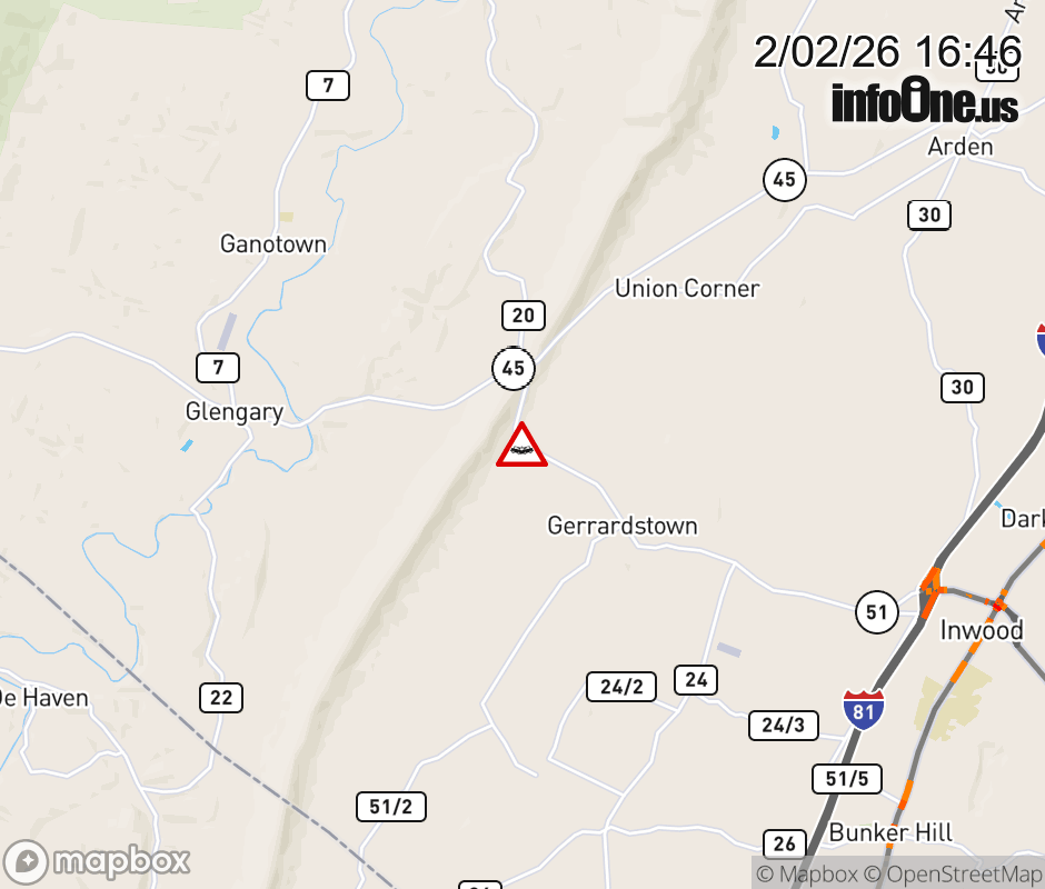 Vehicle Crash on WV-51 (700 BLK of Gerrardstown Rd) in Gerrardstown. Updated: Mon 2/2/26 4:46 PM EST ![]() Updated: Mon 2/2/26 4:46 PM EST |