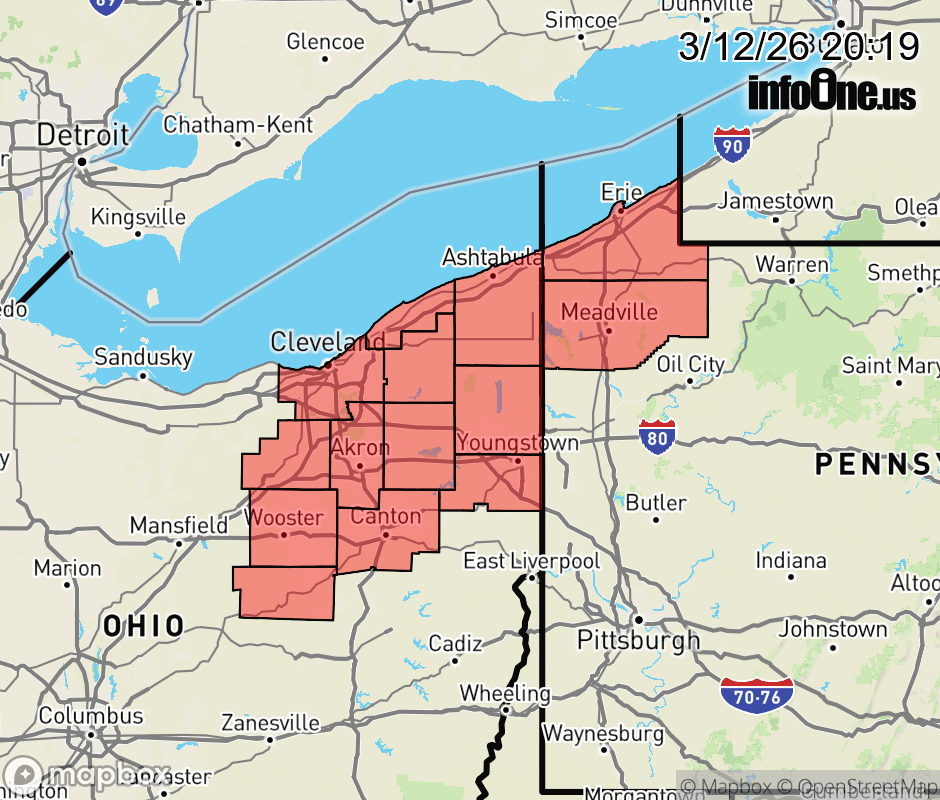 Canceled 3/13/26 2:50 AM High Wind Warning issued March 12 at 8:18PM EDT until March 13 at 8:00PM EDT by NWS Cleveland OH * WHAT... Southwest winds 25 to 35 mph with gusts up to 60 mph expected. * WHERE... Portions of northeast Ohio and northwest Pennsylvania. * WHEN... From 8 AM to 8 PM EDT Friday. * IMPACTS... Damaging winds will blow down trees and power lines. Widespread power outages are expected. Travel will be difficult, especially for high profile vehicles. ![]() |