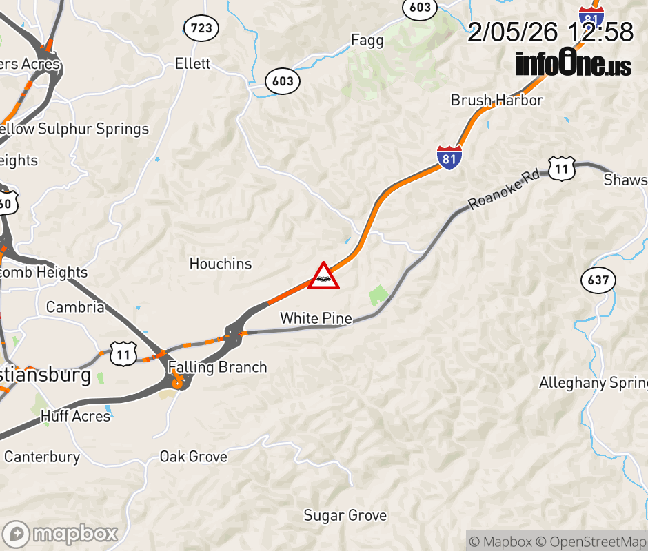 On I-81 at mile marker 120 in the County of Montgomery, motorists can expect delays due to a tractor trailer crash. The north right shoulder is closed. Updated: Thu 2/5/26 12:58 PM EST ![]() Updated: Thu 2/5/26 12:58 PM EST |