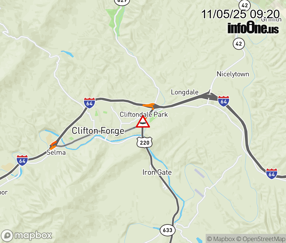 On US-220 North in the County of Alleghany, in the vicinity of Grafton St; US-220S, VA-42S; BUS US-60E/W, motorists can expect delays due to a vehicle crash. Updated: Wed 11/5/25 9:20 AM EST ![]() Updated: Wed 11/5/25 9:20 AM EST |
