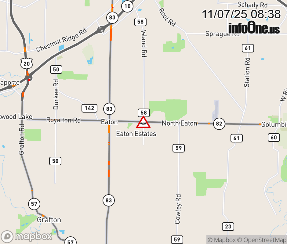 SR-82 CLOSED in BOTH DIRECTIONS from Island Rd to Avon Belden Rd (MM: 3.6), due to crash. Use alternate route. Updated: Fri 11/7/25 8:38 AM EST ![]() Updated: Fri 11/7/25 8:38 AM EST |