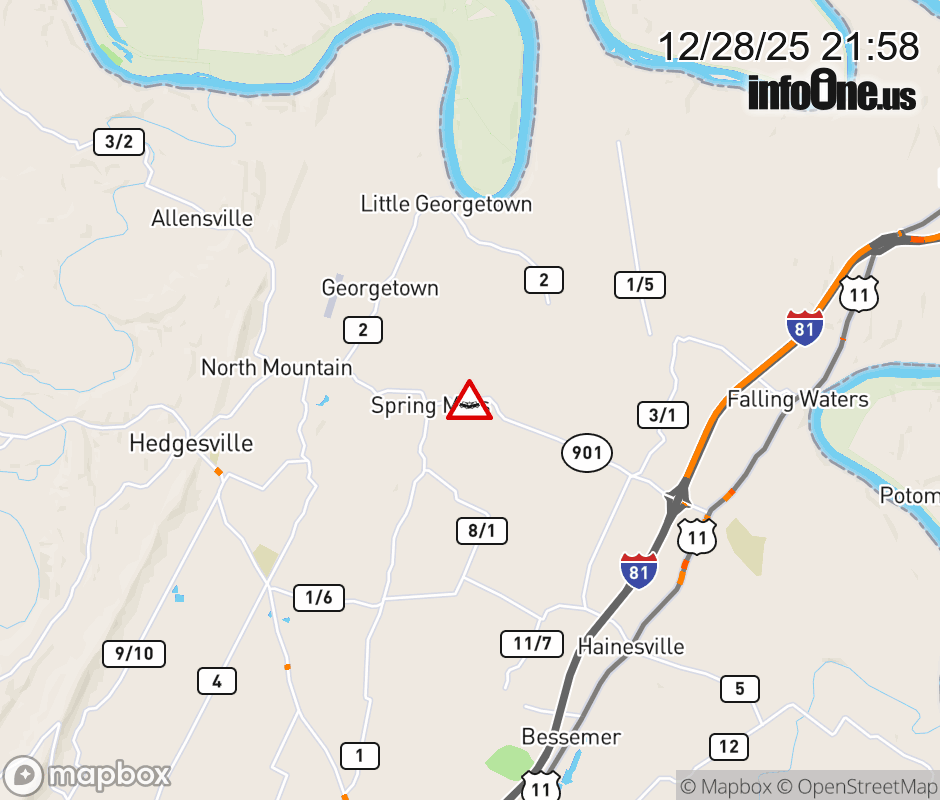 Vehicle Crash on WV-901 (3300 Hammonds Mill Road). The westbound road is closed. Updated: Sun 12/28/25 9:58 PM EST ![]() Updated: Sun 12/28/25 9:58 PM EST |