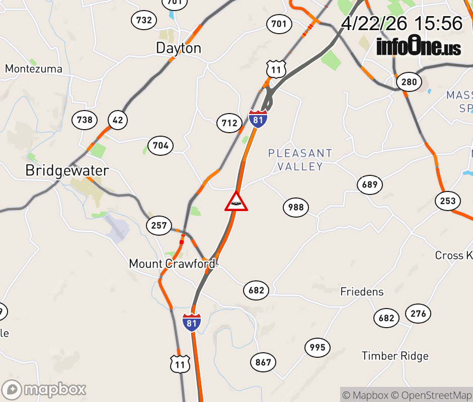 On I-81 North at mile marker 241.3 in the County of Rockingham, motorists can expect delays due to a vehicle crash. Traffic backups are approximately 5.0 miles. Updated: Wed 4/22/26 3:56 PM EDT ![]() Updated: Wed 4/22/26 3:56 PM EDT |