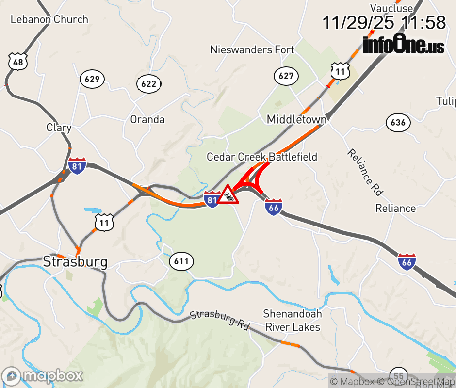 On I-81 South at mile marker 300 in the County of Frederick, motorists can expect delays due to congestion. Traffic backups are approximately 1.0 mile. ![]() |