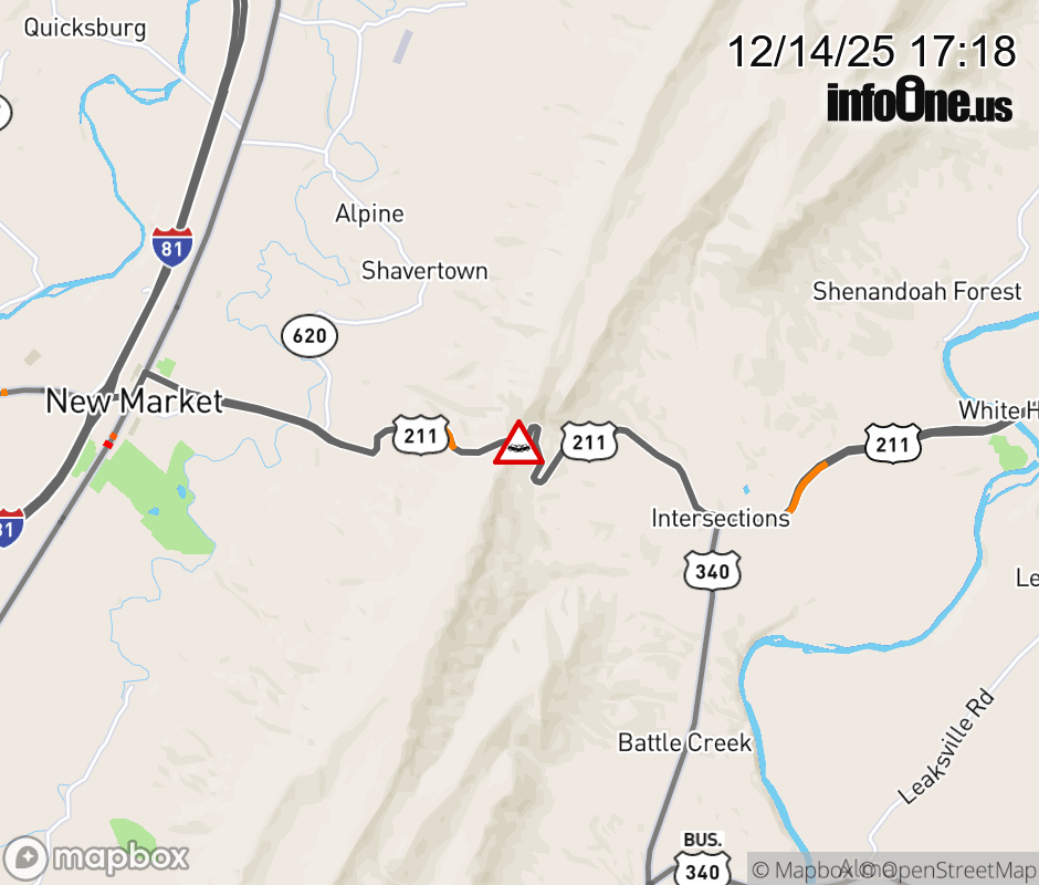 On US-211 in the County of Page, in the vicinity of County/City/Town Line: PAGE CL/SHENANDOAH CL, motorists can expect delays due to a tractor trailer crash. The west right lane and right shoulder are closed. Updated: Sun 12/14/25 5:18 PM EST ![]() Updated: Sun 12/14/25 5:18 PM EST |