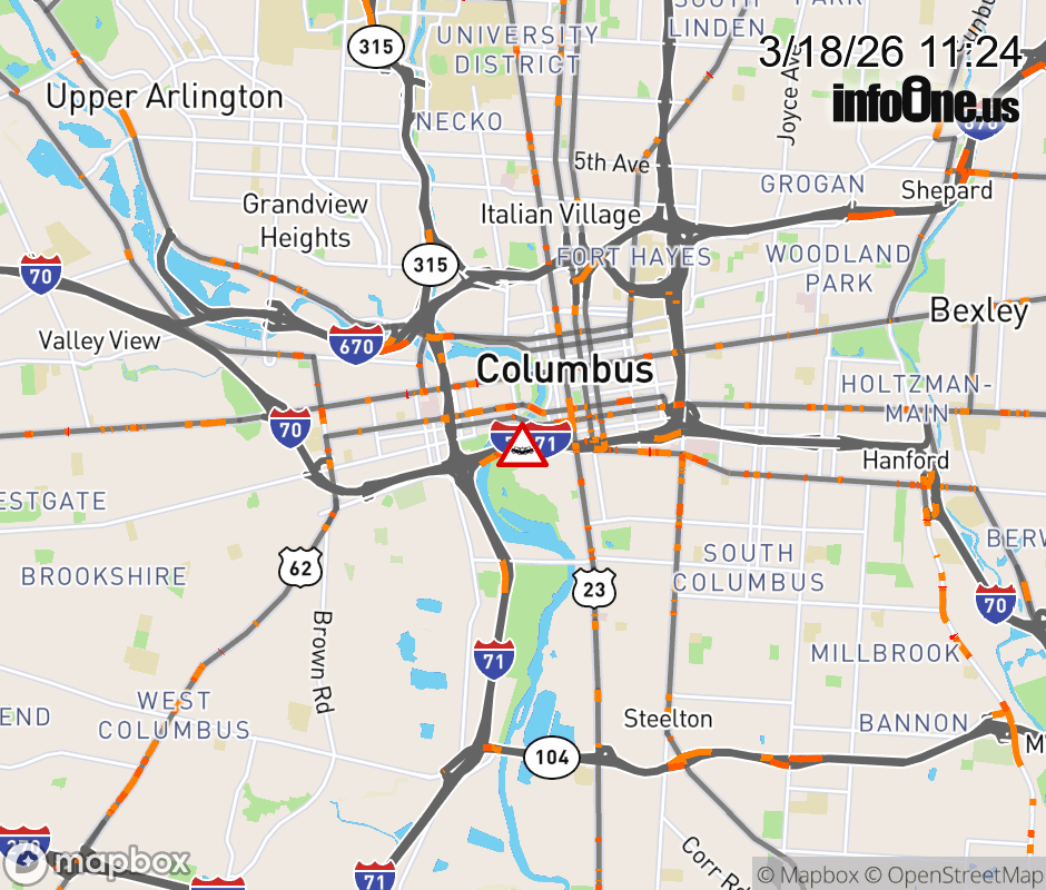 The right lane is blocked on I-70 East/I-71 North at US-23 South/Front St/High St, due to a crash. ![]() |