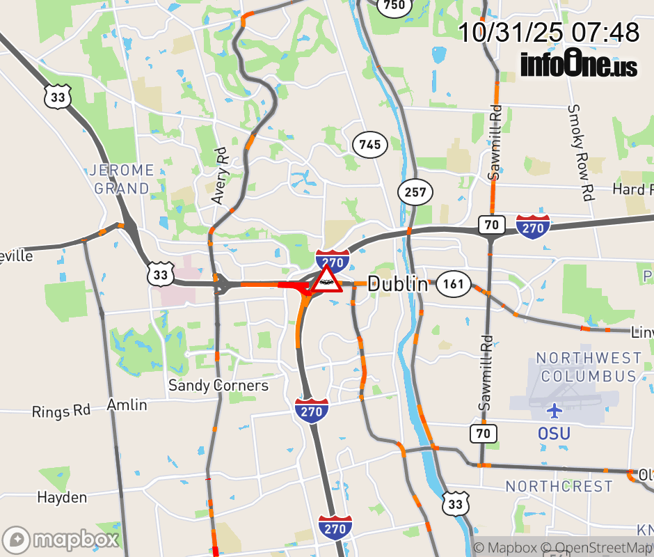 Expect lane closures on Ramp US-33/SR-161 East to I-270 East, due to a crash. ![]() |