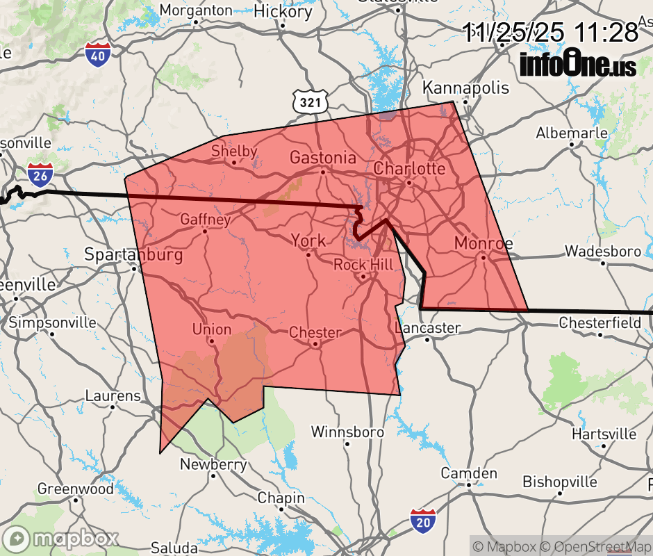 Canceled 11/25/25 12:45 PM Special Weather Statement issued November 25 at 11:27AM EST by NWS Greenville-Spartanburg SC At 1124 AM EST, Doppler radar was tracking a narrow line of heavy showers extending from Rutherfordton to Spartanburg to 15 miles south of Greenwood. Movement was east at 50 mph. HAZARD...Wind gusts up to 35 mph. SOURCE...Radar indicated. IMPACT...Gusty winds could blow around unsecured objects like holiday decorations. Locations impacted include... Gastonia, Rock Hill, Uptown Charlotte, Huntersville, Monroe, Shelby, Gaffney, Union, York, and Chester. ![]() |