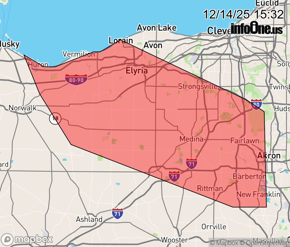 Canceled 12/14/25 5:00 PM Special Weather Statement issued December 14 at 3:30PM EST by NWS Cleveland OH At 330 PM EST, radar indicated an intense lake effect snow band along a line extending from near Wakeman to near Akron, moving southeast at 10 mph. HAZARDS INCLUDE... Winds to 30 mph... Visibility rapidly dropping to less than a quarter of a mile... Snow rates of up to 1 inch per hour... Locations impacted include... Akron, Lorain, Elyria, Medina, Vermilion, Western Vermilion, Cuyahoga Falls, Strongsville, Brunswick, North Royalton, North Ridgeville, Barberton, Green, Wadsworth, Amherst, Grafton, Rittman, Wellington, Doylestown, and Lodi. Use extra caution if you must travel into or through this lake effect snow band. Rapid changes in visibility and potentially slick roads are likely to lead to accidents. Consider delaying travel until this snow band passes your location. ![]() |