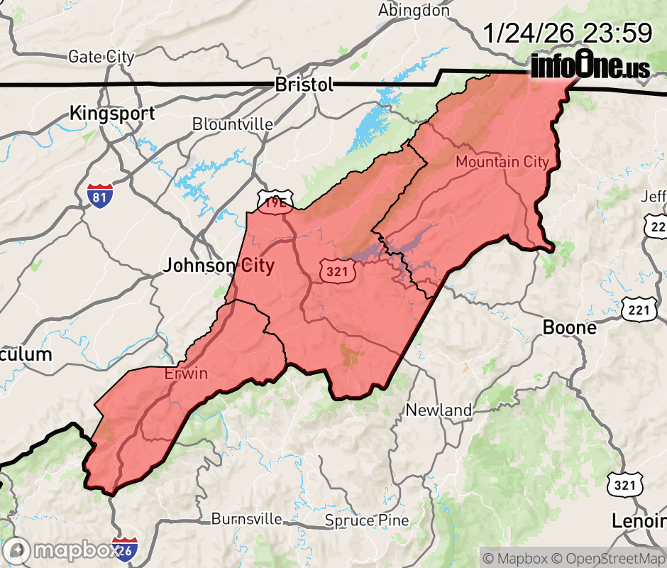 Winter Storm Warning issued January 24 at 11:58PM EST until January 25 at 11:00AM EST by NWS Morristown TN * WHAT... Heavy mixed precipitation. Additional snow accumulations up to one inch and ice accumulations between one tenth and one quarter of an inch. Winds gusting as high as 40 mph. * WHERE... Johnson, Northwest Carter, Southeast Carter, and Unicoi Counties. * WHEN... Until 11 AM EST Sunday. * IMPACTS... Power outages and tree damage are likely due to the ice. Travel could be nearly impossible. ![]() |