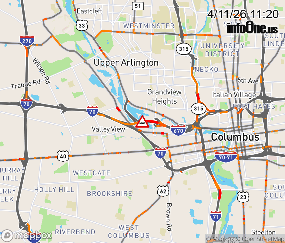 The right shoulder is blocked on I-670 West at US-33, due to a crash. Updated: Sat 4/11/26 11:20 AM EDT ![]() Updated: Sat 4/11/26 11:20 AM EDT |