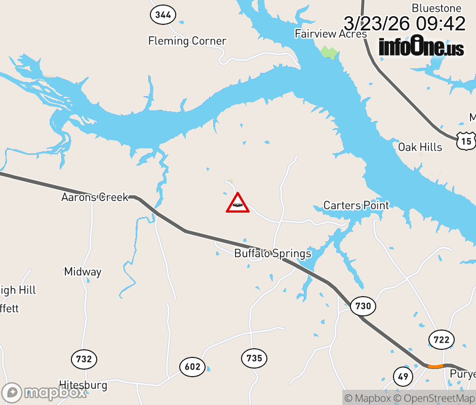On Rt. 731 East in the County of Mecklenburg, in the vicinity of Carters Point Rd; Rt. 722E/W (Mecklenburg County), motorists can expect delays due to a vehicle crash. Lane closures exist. Updated: Mon 3/23/26 9:42 AM EDT ![]() Updated: Mon 3/23/26 9:42 AM EDT |