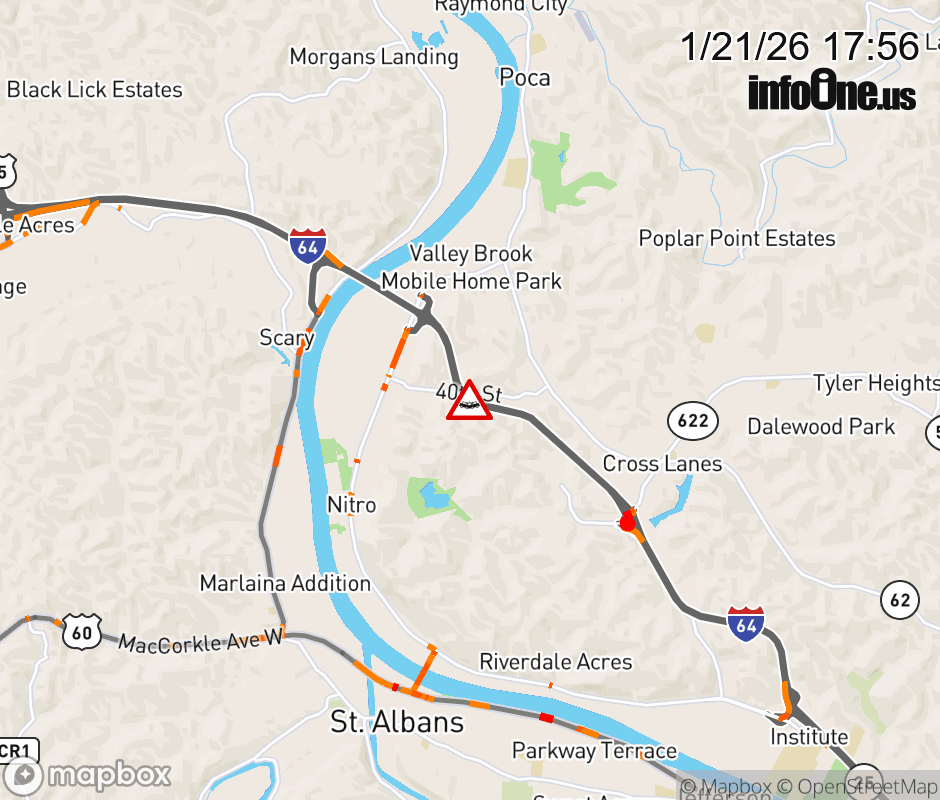Vehicle Crash on I-64E at Mile Marker 45.5. The eastbound 2 right lanes are closed. Updated: Wed 1/21/26 5:56 PM EST ![]() Updated: Wed 1/21/26 5:56 PM EST |