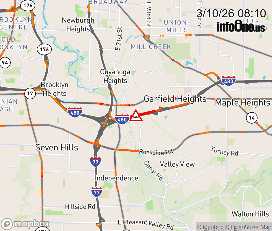 The right lane is blocked on I-480 West beyond Transportation Blvd/E 98th St, due to a crash. Updated: Tue 3/10/26 8:10 AM EDT ![]() Updated: Tue 3/10/26 8:10 AM EDT |