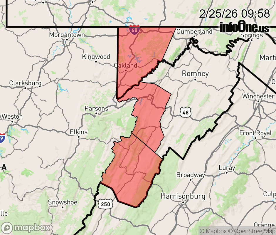 Canceled 2/25/26 11:16 AM Wind Advisory issued February 25 at 9:57AM EST until February 25 at 1:00PM EST by NWS Baltimore MD/Washington DC * WHAT... West winds 20 to 30 mph with gusts of 45 to 50 mph. * WHERE... In Maryland, Western Garrett County. In West Virginia, Western Grant and Western Pendleton Counties. * WHEN... Until 1 PM EST this afternoon. * IMPACTS... Gusty winds will blow around unsecured objects. Tree limbs could be blown down and a few power outages may result. ![]() |