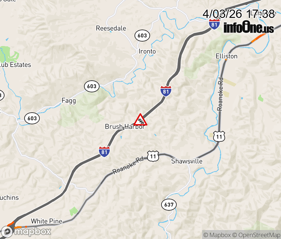 On I-81 South at mile marker 124.1 in the County of Montgomery, motorists can expect delays due to a vehicle fire. Updated: Fri 4/3/26 5:38 PM EDT ![]() Updated: Fri 4/3/26 5:38 PM EDT |