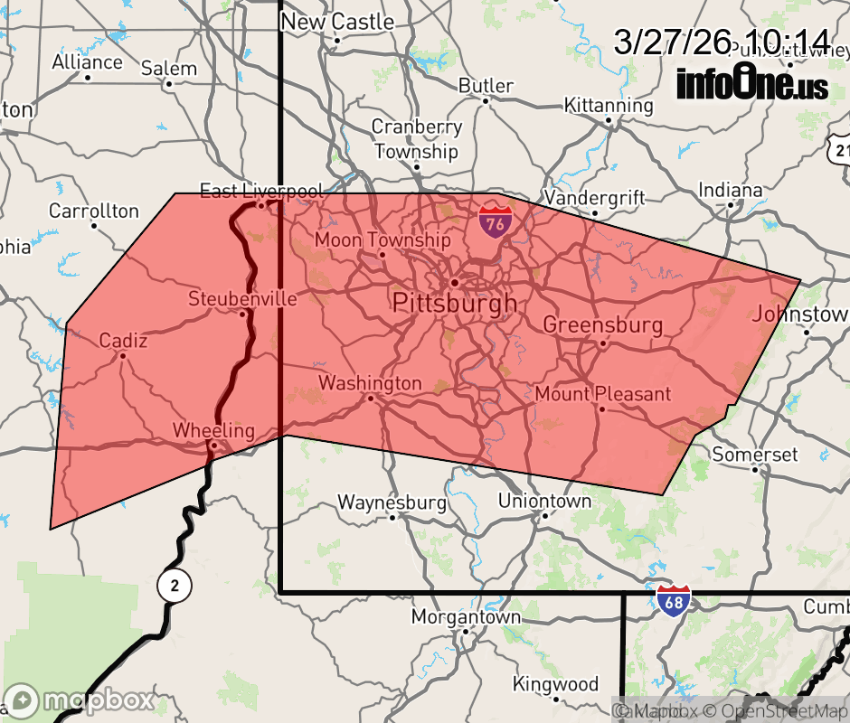 Canceled 3/27/26 4:25 PM Flood Warning issued March 27 at 10:13AM EDT until March 27 at 4:30PM EDT by NWS Pittsburgh PA * WHAT... Flooding caused by excessive rainfall continues. * WHERE... Belmont County in east central Ohio... Southeastern Carroll County in east central Ohio... Southeastern Columbiana County in east central Ohio... Harrison County in east central Ohio... Jefferson OH County in east central Ohio... Allegheny County in southwestern Pennsylvania... Northern Fayette County in southwestern Pennsylvania... Washington County in southwestern Pennsylvania... Westmoreland County in southwestern Pennsylvania... South Central Armstrong County in west central Pennsylvania... Southwestern Indiana County in west central Pennsylvania... Southern Beaver County in western Pennsylvania... Brooke County in northern West Virginia... Hancock County in northern West Virginia... Ohio County in northern West Virginia... * WHEN... Until 430 PM EDT Friday. * IMPACTS... Flooding of rivers, creeks, streams, and other low-lying and flood-prone locations is imminent or occurring. * ADDITIONAL DETAILS... - At 1012 AM EDT, Doppler radar and automated rain gauges indicated heavy rain. Flooding is ongoing in the warned area. Between 1.5 and 2.5 inches of rain have fallen. - Some locations that will experience flooding include... Pittsburgh, Penn Hills, Mount Lebanon, Bethel Park, Ross Township, Wheeling, McCandless Township, Monroeville, Moon Township, McMurray, Greensburg, Weirton, McKeesport, Steubenville, Washington, Franklin Park, East Liverpool, Jeannette, Aliquippa and Canonsburg. - http://www.weather.gov/safety/flood ![]() |