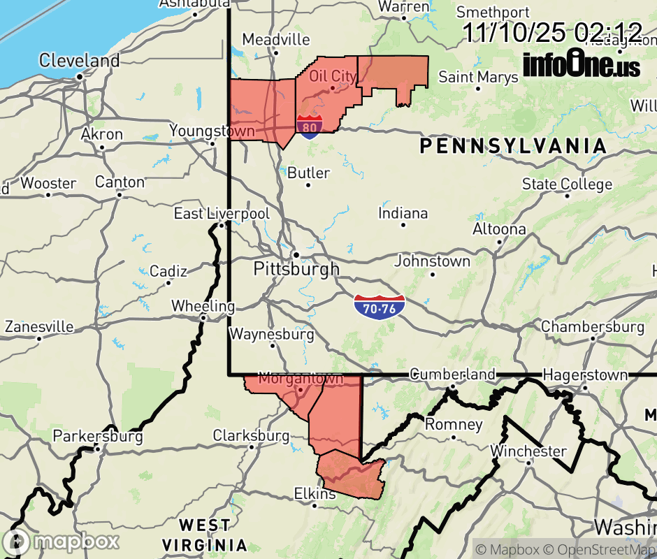 Canceled 11/10/25 12:00 PM Winter Weather Advisory issued November 10 at 2:11AM EST until November 11 at 1:00PM EST by NWS Pittsburgh PA * WHAT... Snow. Additional snow accumulations between 3 and 6 inches. Winds gusting as high as 40 mph. * WHERE... Portions of northwest Pennsylvania and northern West Virginia. * WHEN... Until 1 PM EST Tuesday. * IMPACTS... Travel could be very difficult. The hazardous conditions will impact the Monday morning and evening commutes. As well as the Tuesday morning commute. ![]() |