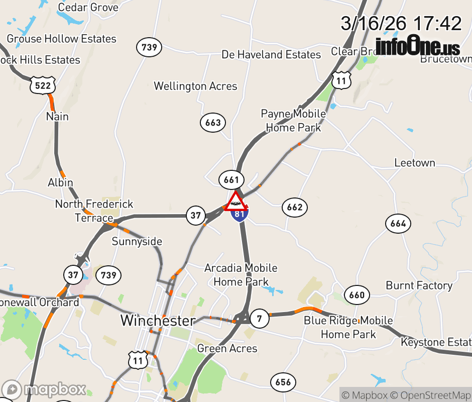 On US-11 in the County of Frederick, in the vicinity of the ramp from and to I-81S, motorists can expect delays due to a vehicle crash. The north left shoulder is closed. ![]() |