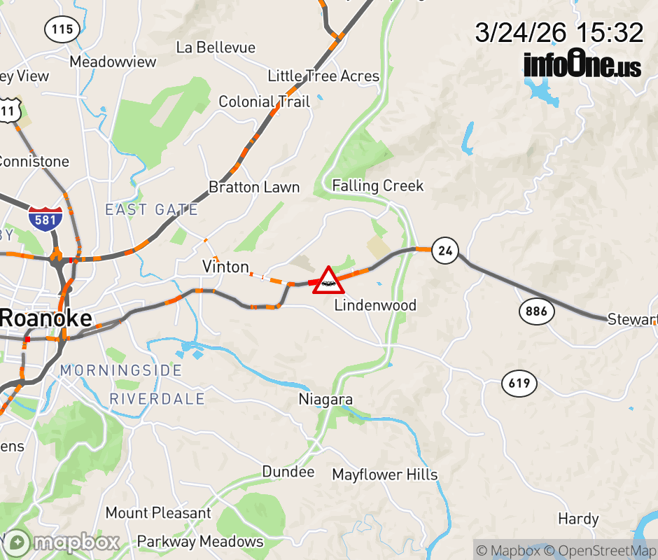 On VA-24 in the County of Roanoke, in the vicinity of Goode Park Rd; Rt. 961N/S (Roanoke County), motorists can expect delays due to a vehicle crash. The east left shoulder and left lane are closed. ![]() |