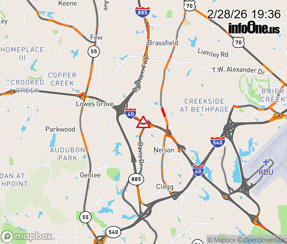 The right shoulder is closed after Exit 280 (Davis Dr). Updated: Sat 2/28/26 7:36 PM EST ![]() Updated: Sat 2/28/26 7:36 PM EST |