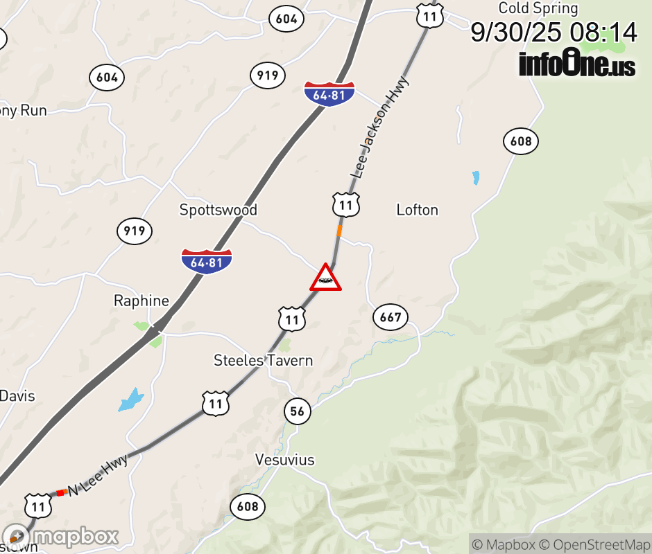 On US-11 in the County of Augusta, in the vicinity of Spottswood Rd; Rt. 620E/W (Augusta County), motorists can expect delays due to a vehicle crash. All south lanes are closed. ![]() |