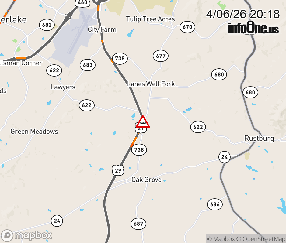 On US-29 in the County of Campbell, in the vicinity of English Tavern Rd, motorists can expect delays due to a vehicle crash. The south left shoulder and left lane are closed. Updated: Mon 4/6/26 8:18 PM EDT ![]() |