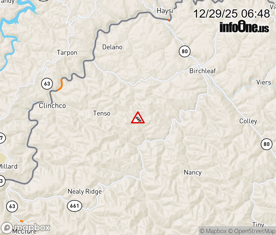 On Rt. 652 in the County of Dickenson, in the vicinity of Turkey Br; Rt. 664N/S (Dickenson County), motorists can expect delays due to weather. All south lanes are closed. ![]() |