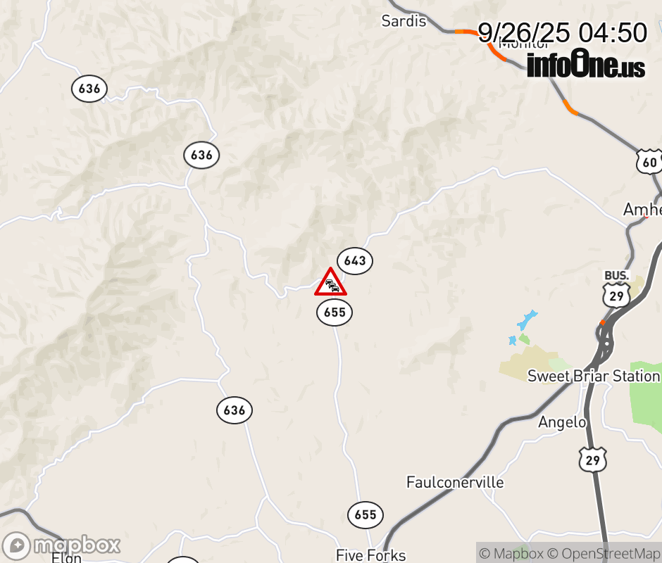 On Rt. 643 in the County of Amherst, in the vicinity of Father Judge Rd; Matohe Rd; Rt. 655N/S (Amherst County), motorists can expect delays due to weather. All east lanes are closed. All west lanes are closed. ![]() |