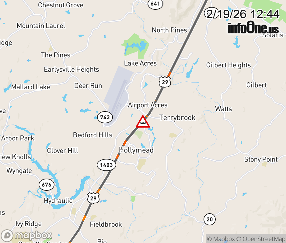 On US-29 in the County of Albemarle, in the vicinity of Crossover; Timberwood Blvd; Rt. 1721N (Albemarle County); Rt. 1721N/S (Albemarle County); Rt. 1721S (Albemarle County), motorists can expect delays due to a vehicle crash. The north right shoulder is closed. ![]() |