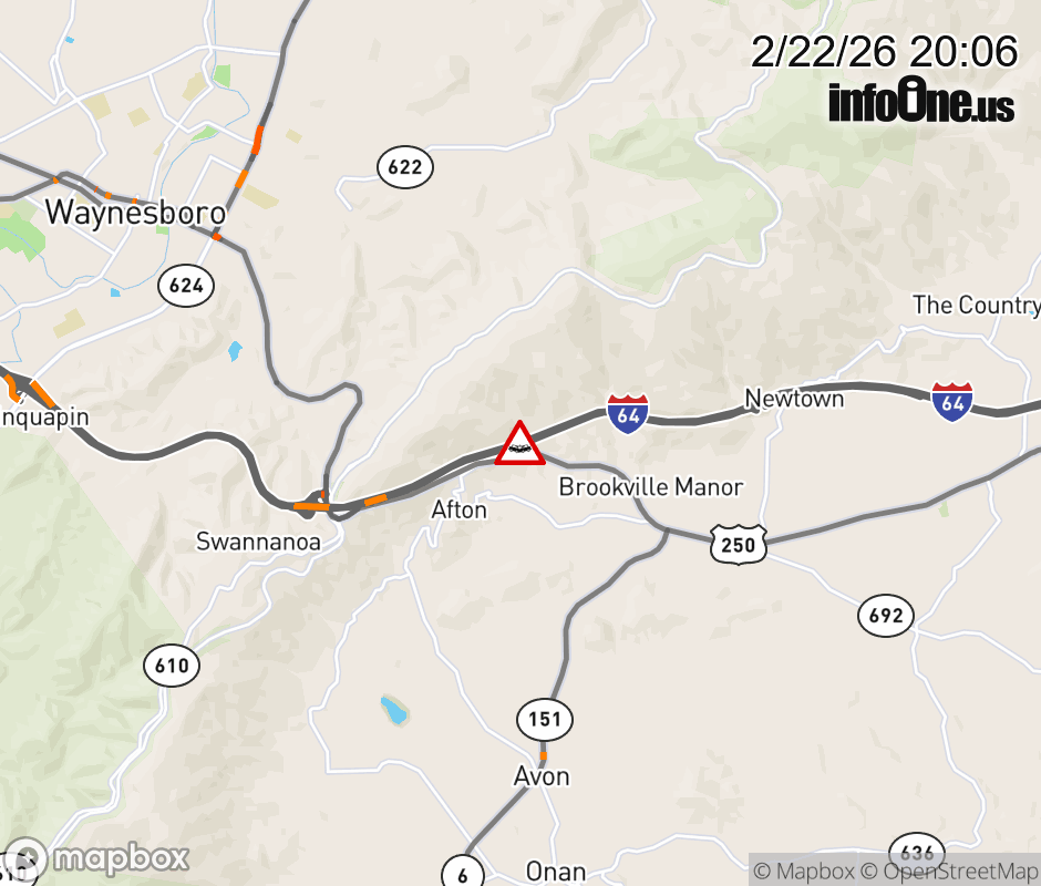 On I-64 at mile marker 101.5 in the County of Albemarle, motorists can expect delays due to a tractor trailer crash. The west right shoulder is closed. Updated: Sun 2/22/26 8:06 PM EST ![]() Updated: Sun 2/22/26 8:06 PM EST |