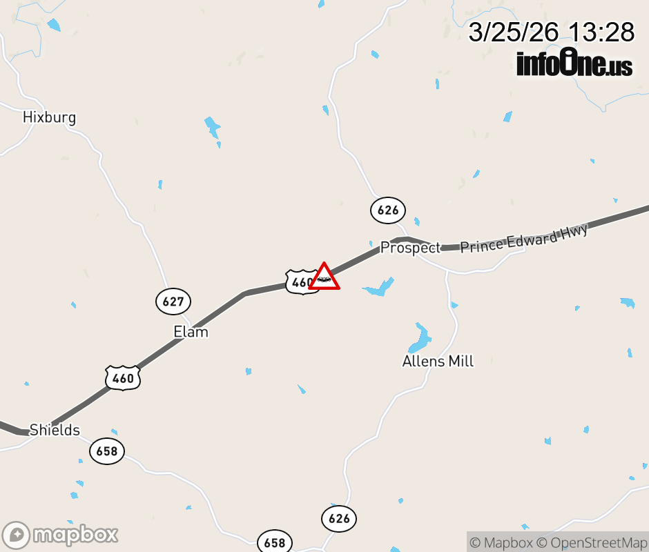 On US-460 in the County of Prince Edward, in the vicinity of Prince Edward Hwy, motorists can expect delays due to a tractor trailer crash. The west left shoulder and left lane are closed. ![]() |