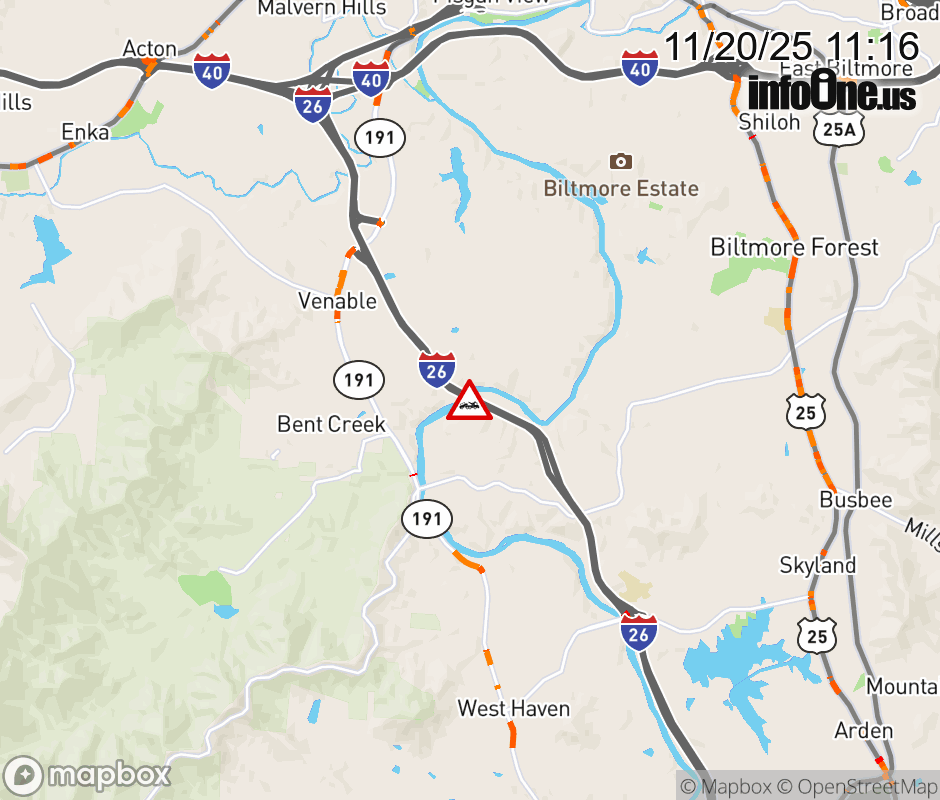 The right shoulder is closed two miles east of Exit 33, NC 191 (Brevard Road). Updated: Thu 11/20/25 11:16 AM EST ![]() Updated: Thu 11/20/25 11:16 AM EST |