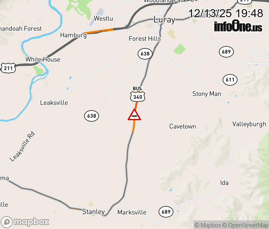 On BUS US-340 North in the County of Page, in the vicinity of Mill Creek Crossroads; Rt. 633E/W (Page County), motorists can expect delays due to a vehicle crash. Updated: Sat 12/13/25 7:48 PM EST ![]() Updated: Sat 12/13/25 7:48 PM EST |