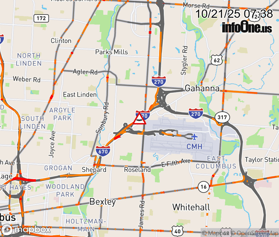 The left shoulder is blocked on I-670/US-62 West beyond I-270, due to a crash. ![]() |
