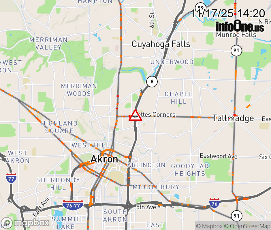 The 2 left lanes are blocked on SR-8 North/SR-59 East beyond SR-261/Tallmadge Ave, due to a crash. ![]() |