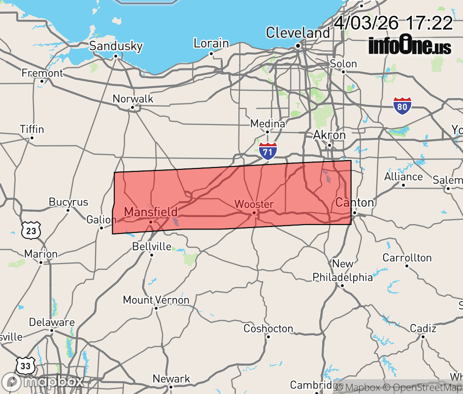 Canceled 4/3/26 7:11 PM Flood Advisory issued April 3 at 5:21PM EDT until April 3 at 8:30PM EDT by NWS Cleveland OH * WHAT... Flooding caused by excessive rainfall is expected. * WHERE... Portions of north central and northeast Ohio, including the following counties, in north central Ohio, Ashland and Richland. In northeast Ohio, Medina, Stark, Summit and Wayne. * WHEN... Until 830 PM EDT. * IMPACTS... Minor flooding in low-lying and poor drainage areas. * ADDITIONAL DETAILS... - At 521 PM EDT, Doppler radar indicated heavy rain due to thunderstorms. Minor flooding is ongoing or expected to begin shortly in the advisory area. Between 0.5 and 1 inch of rain has fallen. - Some locations that will experience flooding include... Akron, Canton, Mansfield, Wooster, Ashland, Massillon, Barberton, Green, Wadsworth, North Canton, Shelby, Orrville, Rittman, Ontario, Crestline, Doylestown, Creston, Dalton, West Salem and Hayesville. - Please visit www.weather.gov/safety/flood for flood safety and preparedness information. ![]() |