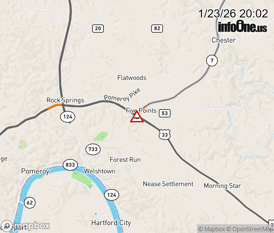 US-33 CLOSED in BOTH DIRECTIONS from SR-124 to 1.3 miles beyond Pine Grove Rd (MM: 26.1), due to crash. Use alternate route. ![]() |